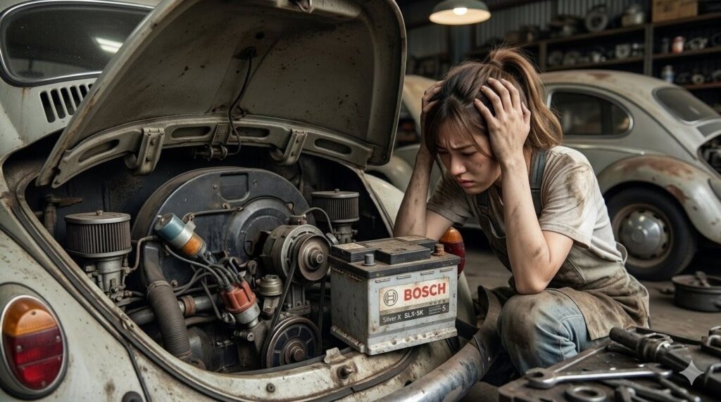 いざ交換しようと調べてみると、6Vから12Vへのコンバート仕様だったり、シート下の狭いスペースに収まるサイズ探しだったりと、空冷ワーゲン特有の壁にぶつかることも多いはず。